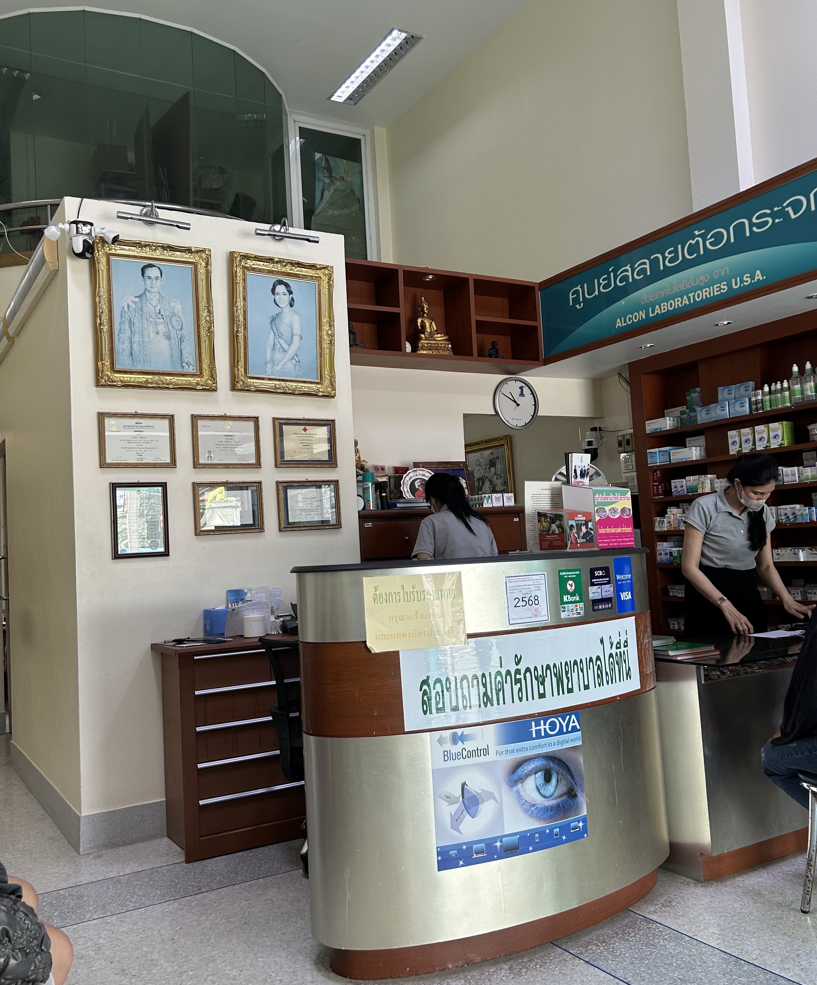 Dans les lieux publics, on trouve partout le portrait du roi actuel et de la reine actuelle. Mais ici au-dessus du bureau de l’ophtalmo, comme vous pouvez le constater, ce sont les portraits du roi Rama IX et de la reine Sirikit qui sont toujours affichés. C’est la même chose dans beaucoup de maison thaïlandaises. Les portraits n’ont pas été remplacés.