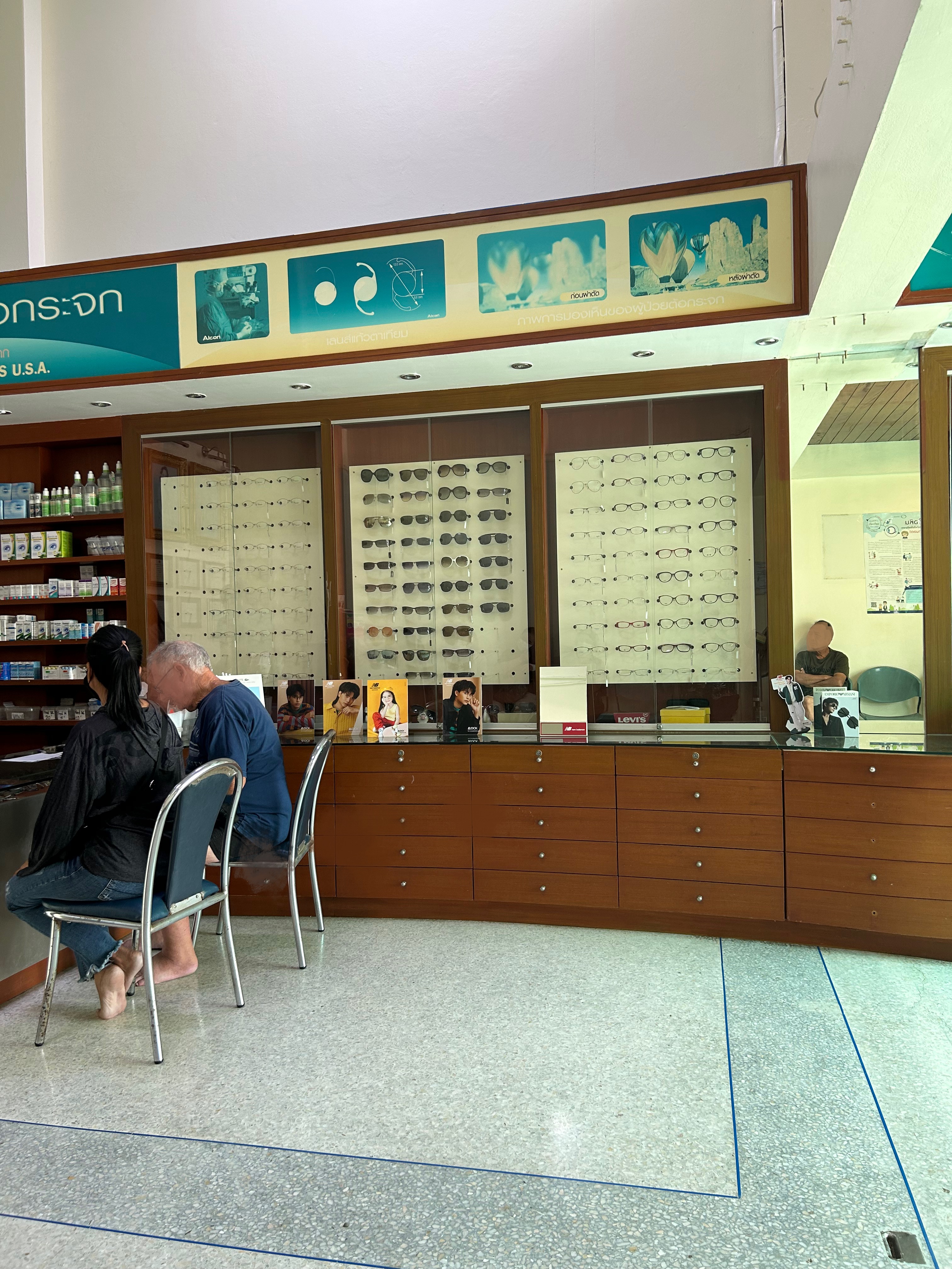 Mon ophtalmologiste comme la plupart ici, peut-être tous, est également opticien. Bien qu’il y ait de très nombreux magasins d’optique en ville, l’ophtalmo se charge de fabriquer ou en tout cas de faire fabriquer et adapter des lunettes à notre vue. C’est ainsi que cet ophtalmo m’a opéré de la cataracte à l’hôpital qui est juste à côté puis ensuite a trouvé des bonnes lunettes pour moi et me les a livrées ; c’est quand même très pratique parce qu’il y a pas besoin d’aller dans différents magasins.