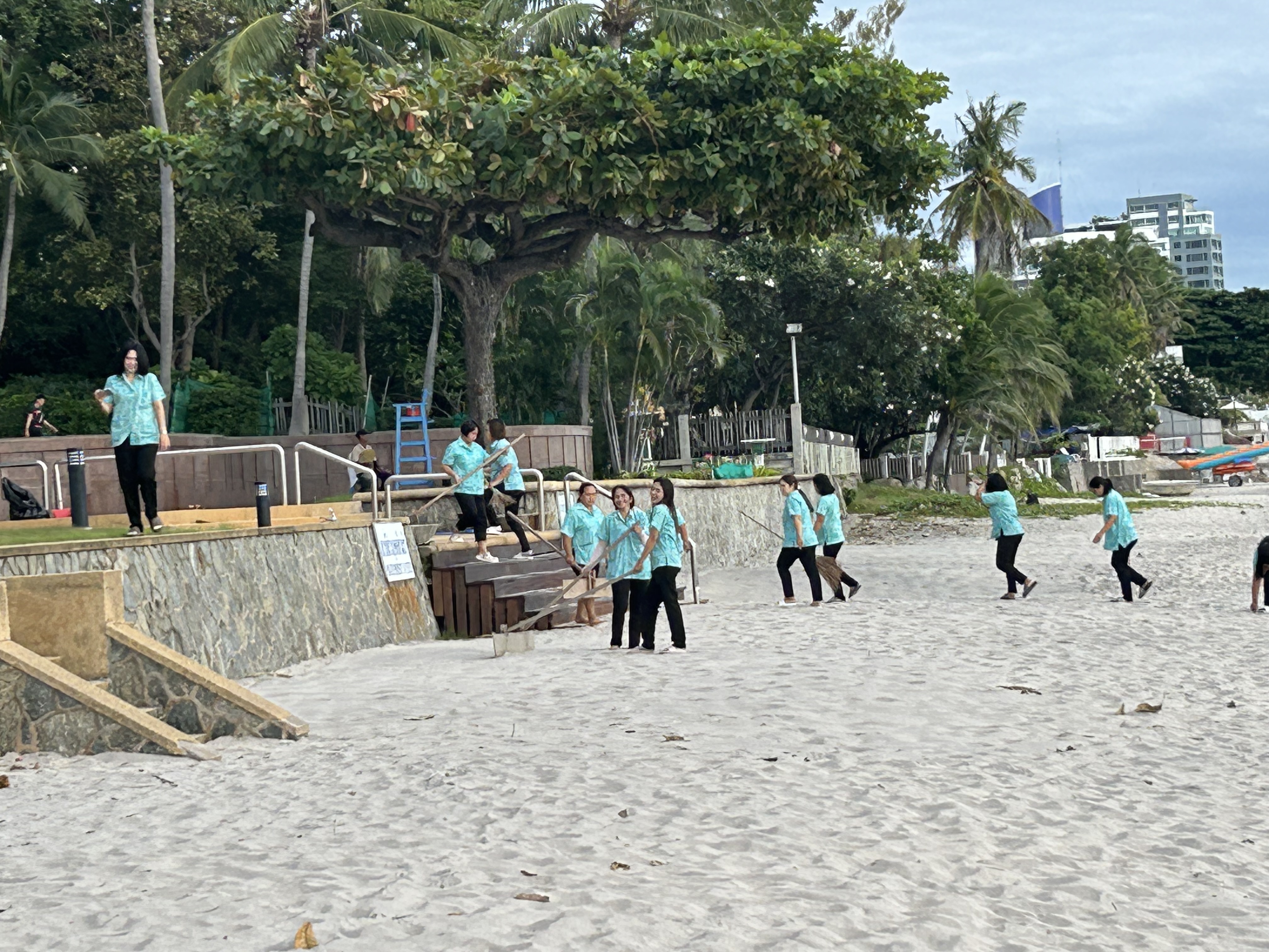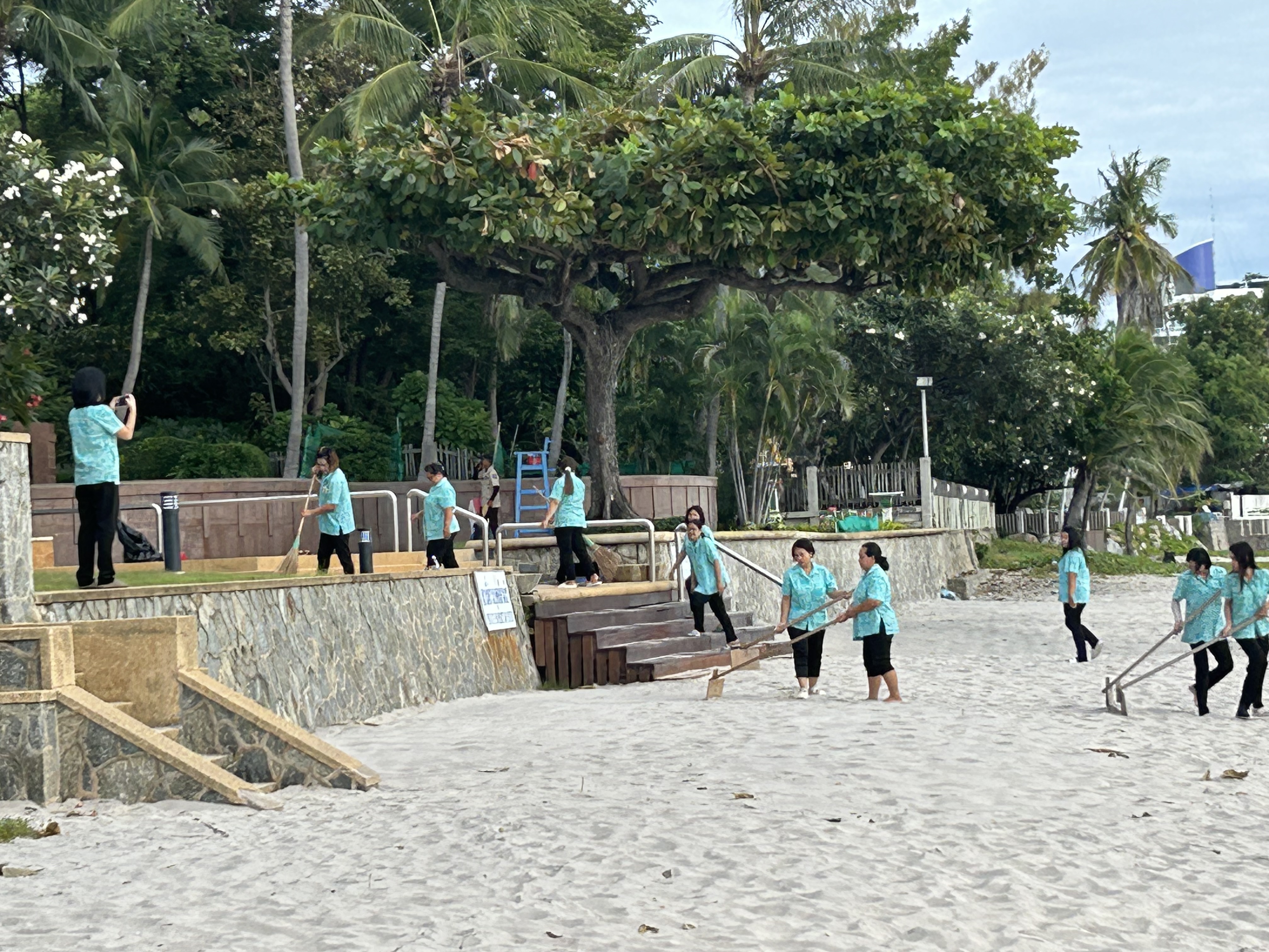 Vous pourrez souvent voir une équipe de travailleurs, dans cet exemple toutes les femmes employées au nettoyage de cette résidence, se prendre en photo le matin pendant un grand nettoyage, ici de la plage devant la résidence.