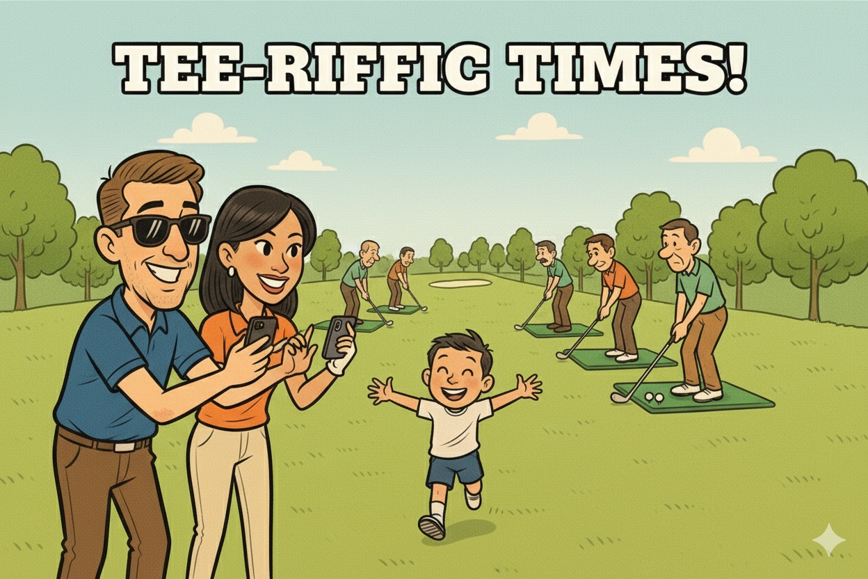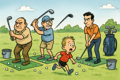 C’est un mal moderne hélas de considérer que les enfants sont rois partout, y compris sur un practice de golf, qui est quand même un endroit assez dangereux. Bref je me suis mis par sécurité à jouer de tous petits coups de wedge jusqu’à la fin du cours de HMDM qui n’a d’ailleurs pas tardé, puisque ça l’intéressait beaucoup plus de courir après les balles que d’essayer de les toucher avec son club.
