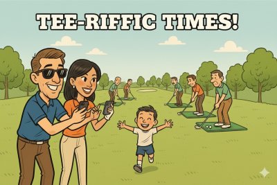 Mais non pas du monsieur golfeur, mais du petit garçon qui a environ quatre ans. Papa lui a acheté pour l’occasion deux petits clubs à sa taille. Le prof essaye de lui expliquer quelques rudiments, mais le petit garçon sans doute un peu trop jeune (n’est pas Tiger qui veut) ne semble guère intéressé.