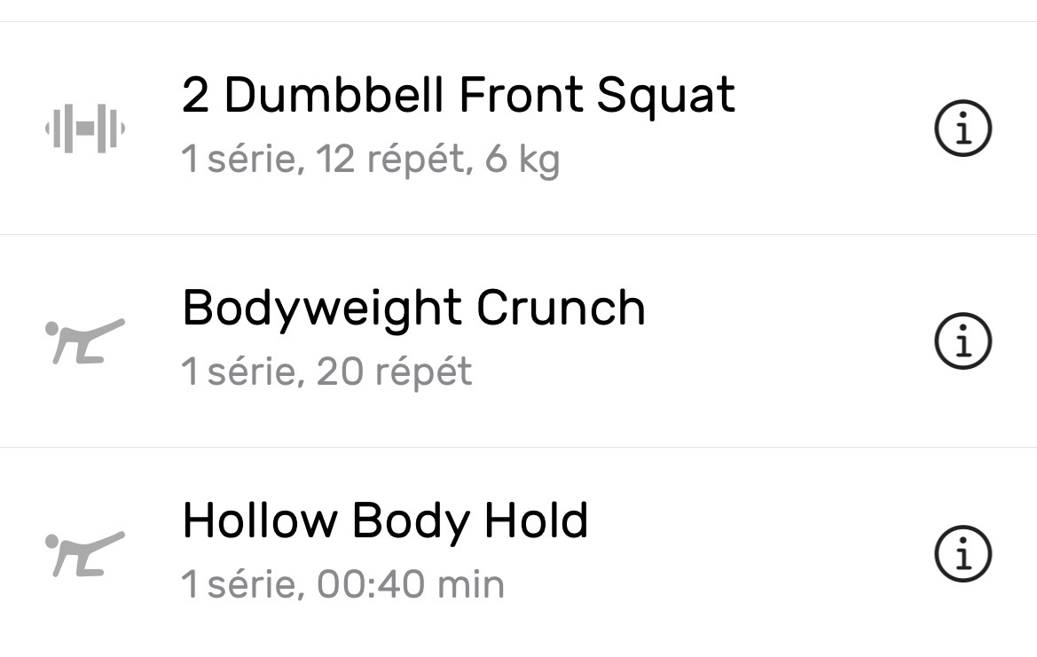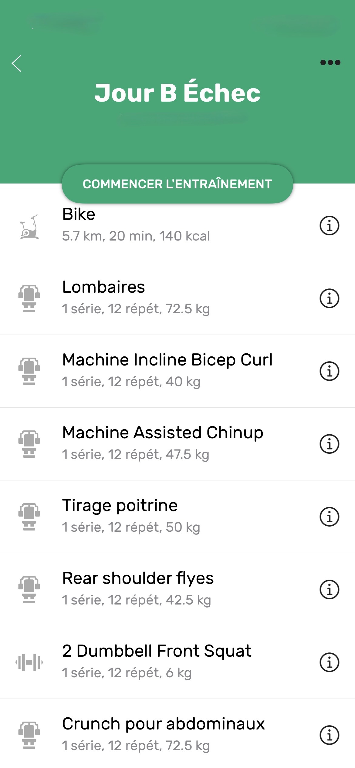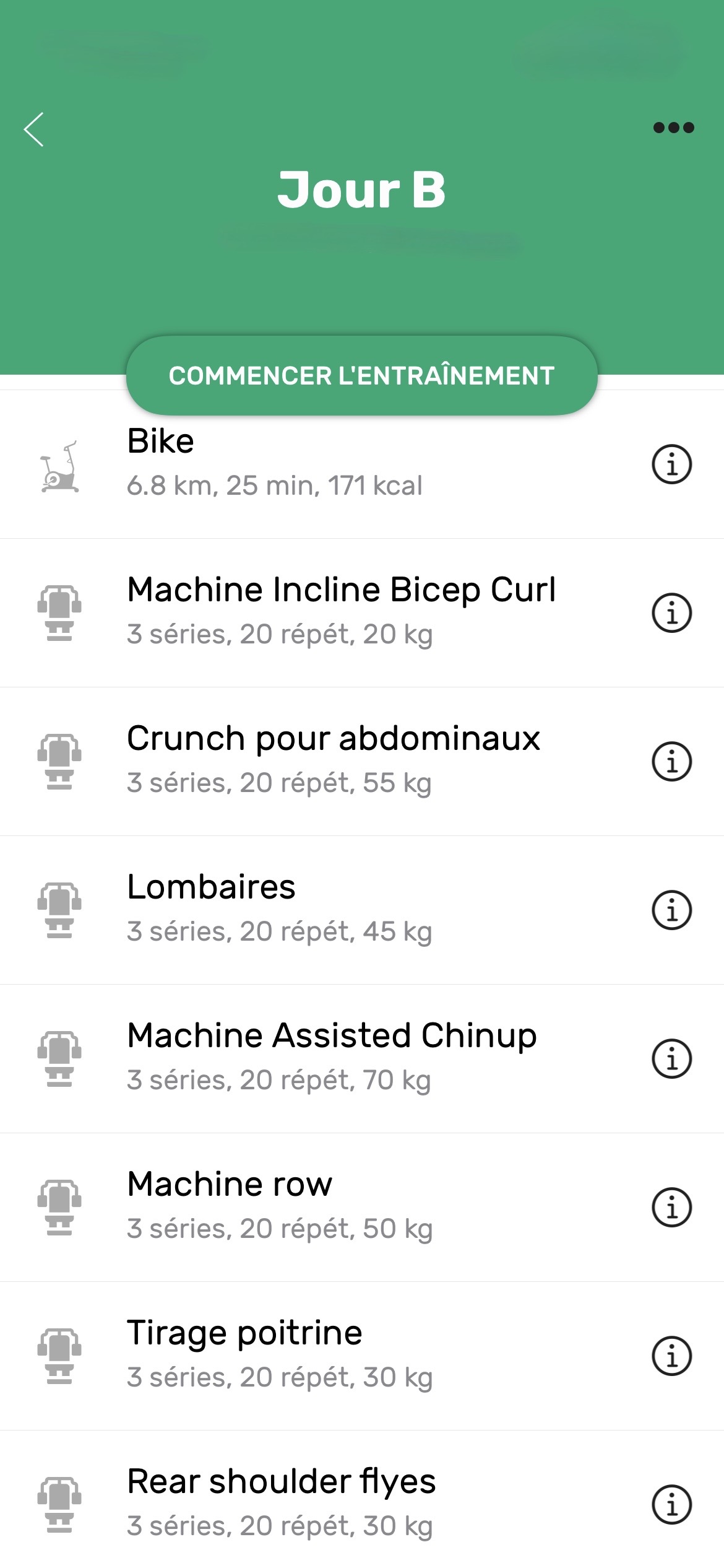 I use the same machines as in the first phase, day A and day B, but only one set of 12 repetitions on each machine, with much heavier weights designed to fatigue the muscle. Apparently, this is the best way to gain volume and strength. I am careful not to go to complete failure so as not to injure myself because I recover less well now. As you can see, I have added floor exercises to the machine exercises, mainly to work on my stomach.