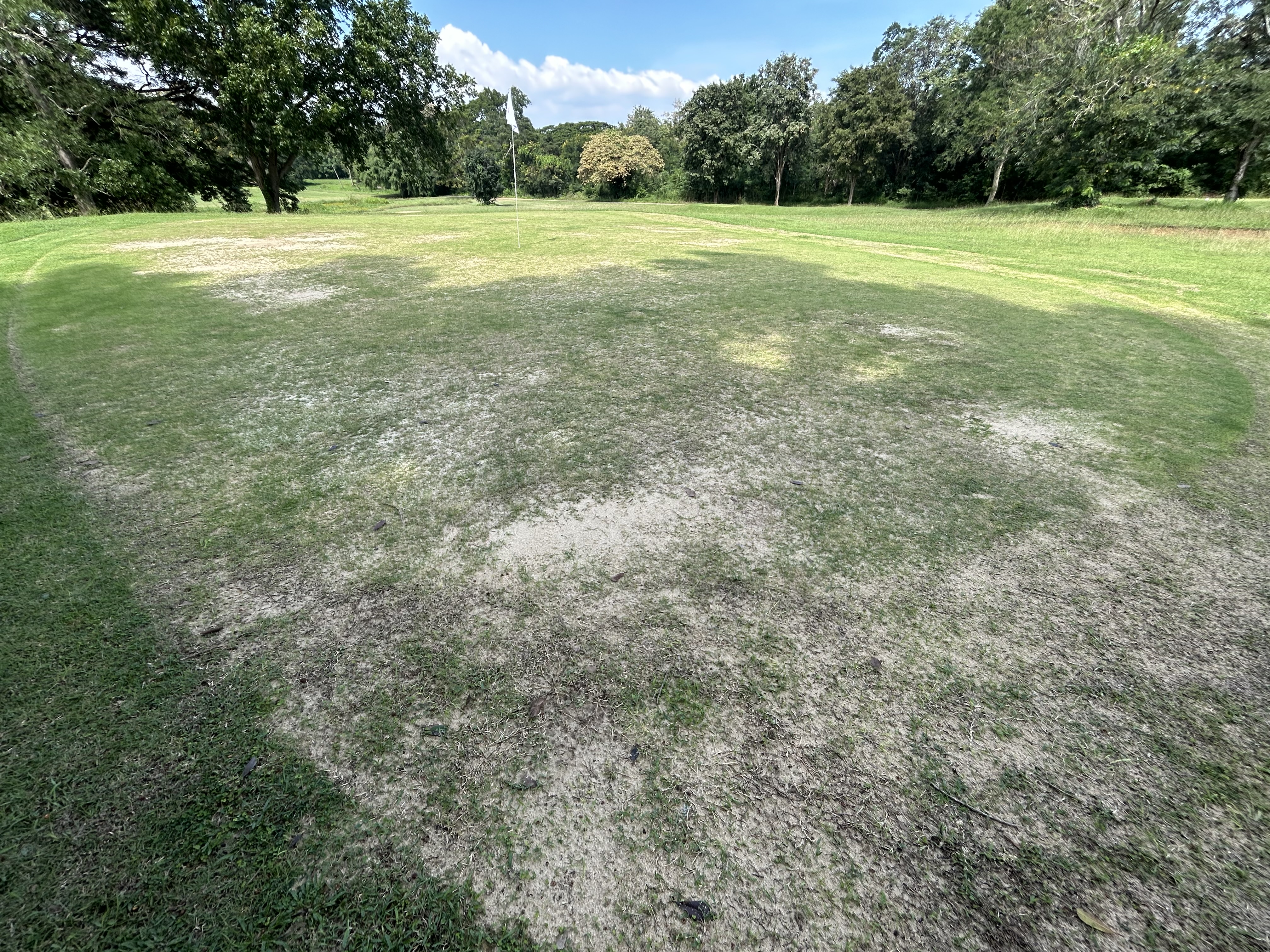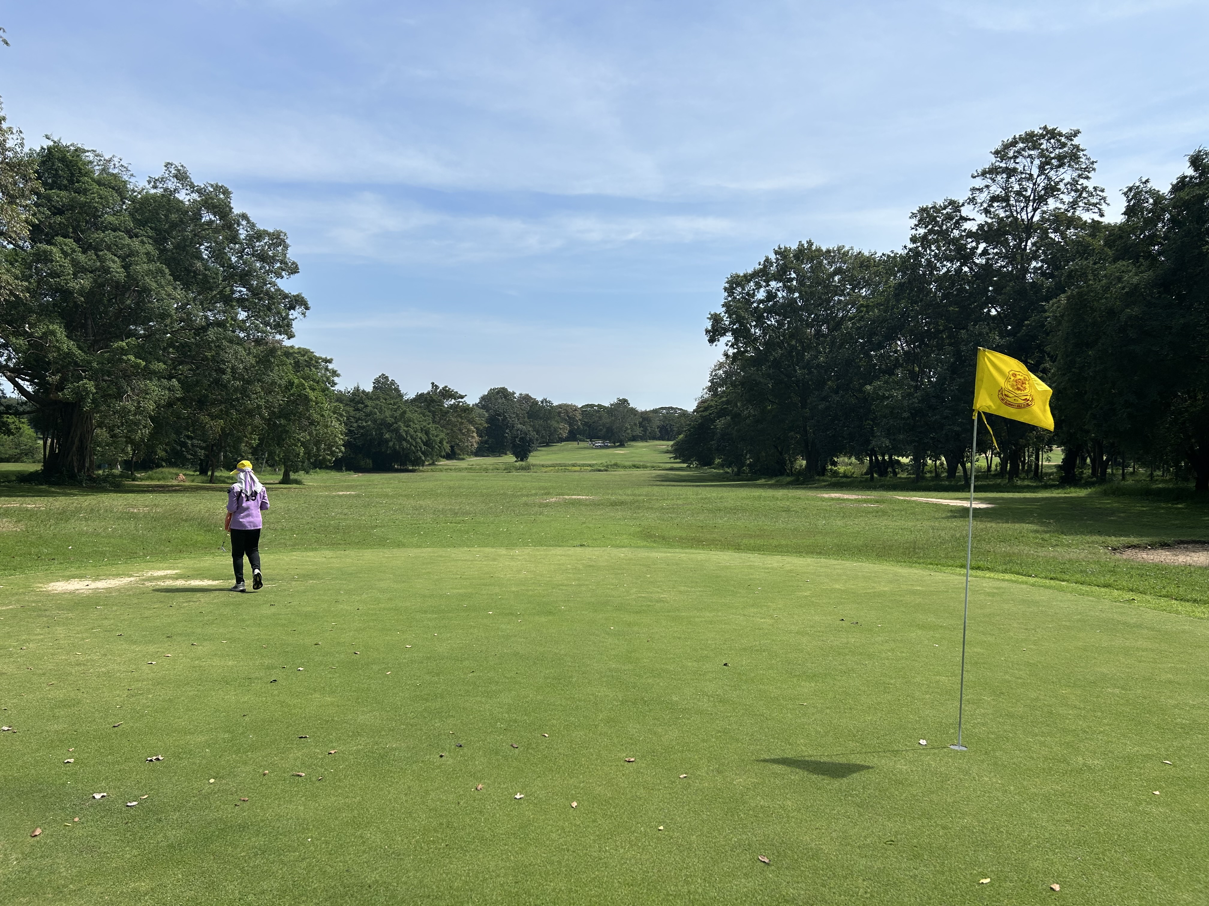 D’autant plus intéressant que le parcours est par contre loin d’être ridicule. C’est un véritable parcours de 18 trous avec de nombreux doglegs, des greens parfois très bien défendus, des mises en jeu qui peuvent être étroites et délicates. De plus, il peut parfois y avoir un vent assez fort. J’apprécie vraiment ce parcours, malgré l’absence TOTALE d’herbe sur les fairways à la saison sèche. Étonnamment, dès la première pluie ils reverdissent vite. Je pense que l’herbe thaïlandaise à la capacité de se mettre en sommeil sans mourir.