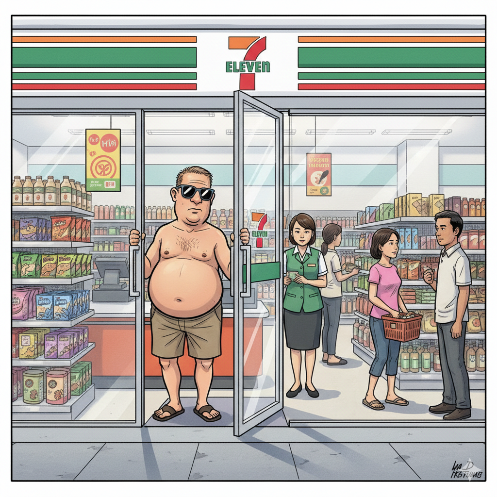 En Thaïlande, il est extrêmement impoli de se promener torse nu en ville. Et comme c’est d’ailleurs le cas en Europe c’est interdit.