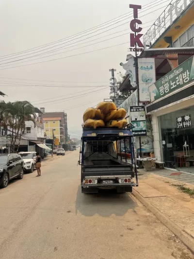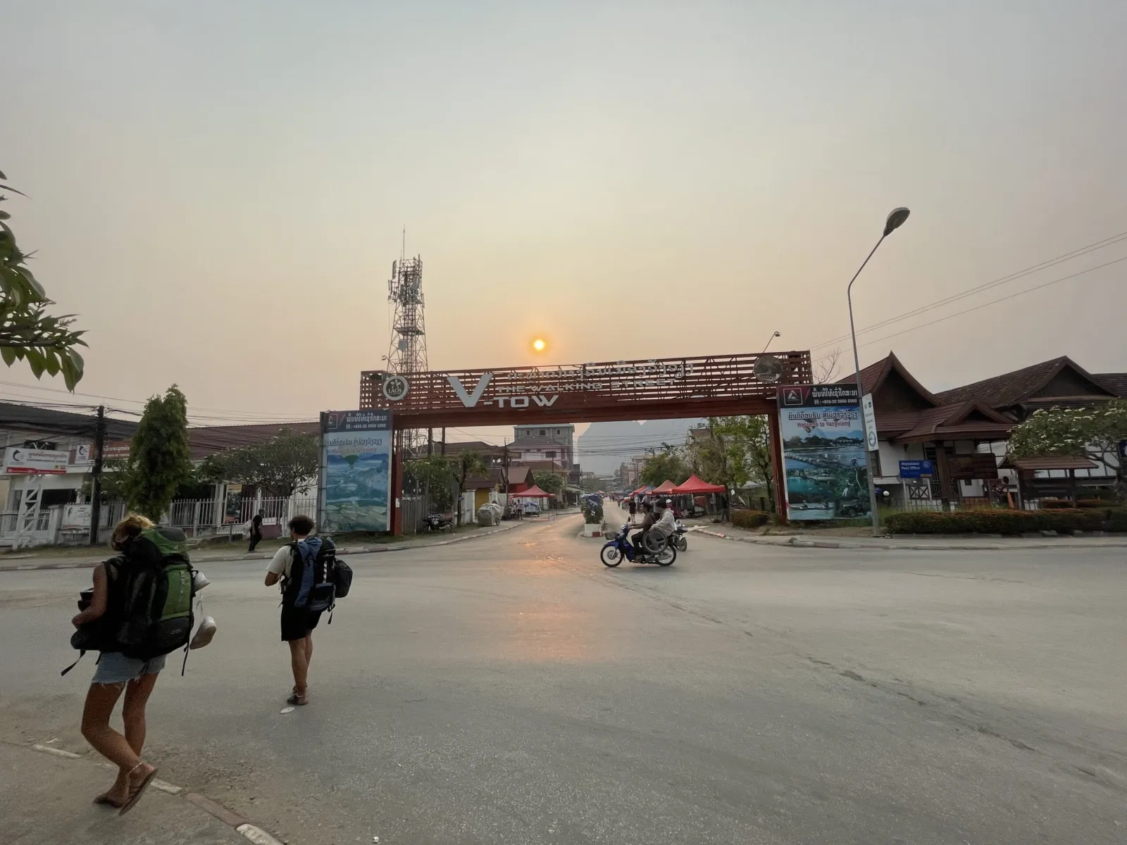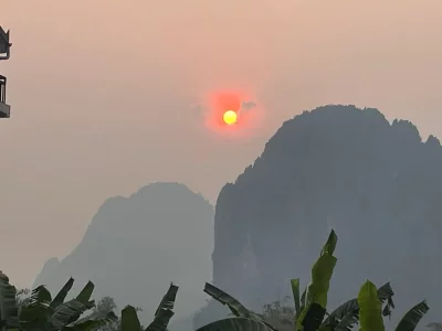 Vang Vieng est une ville moyenne d’environ 20 000 habitants à 2h au nord de Vientiane. Je m’y suis rendu à la saison des brulis. Le ciel est toujours brumeux donc, et d’une luminosité particulière, mais je n’ai pas ressenti de gène respiratoire.